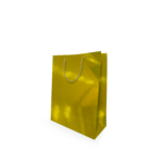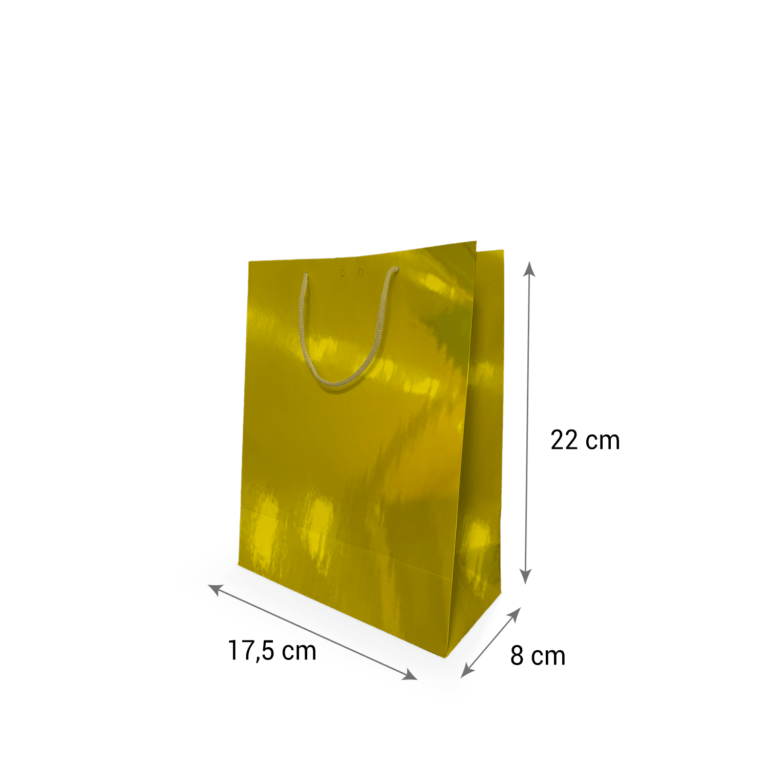 Sacola de papel dourada premium 17,5x22x8cm ideal para presentes e lojas. Elegante, resistente e perfeita para agregar sofisticação aos seus produtos.