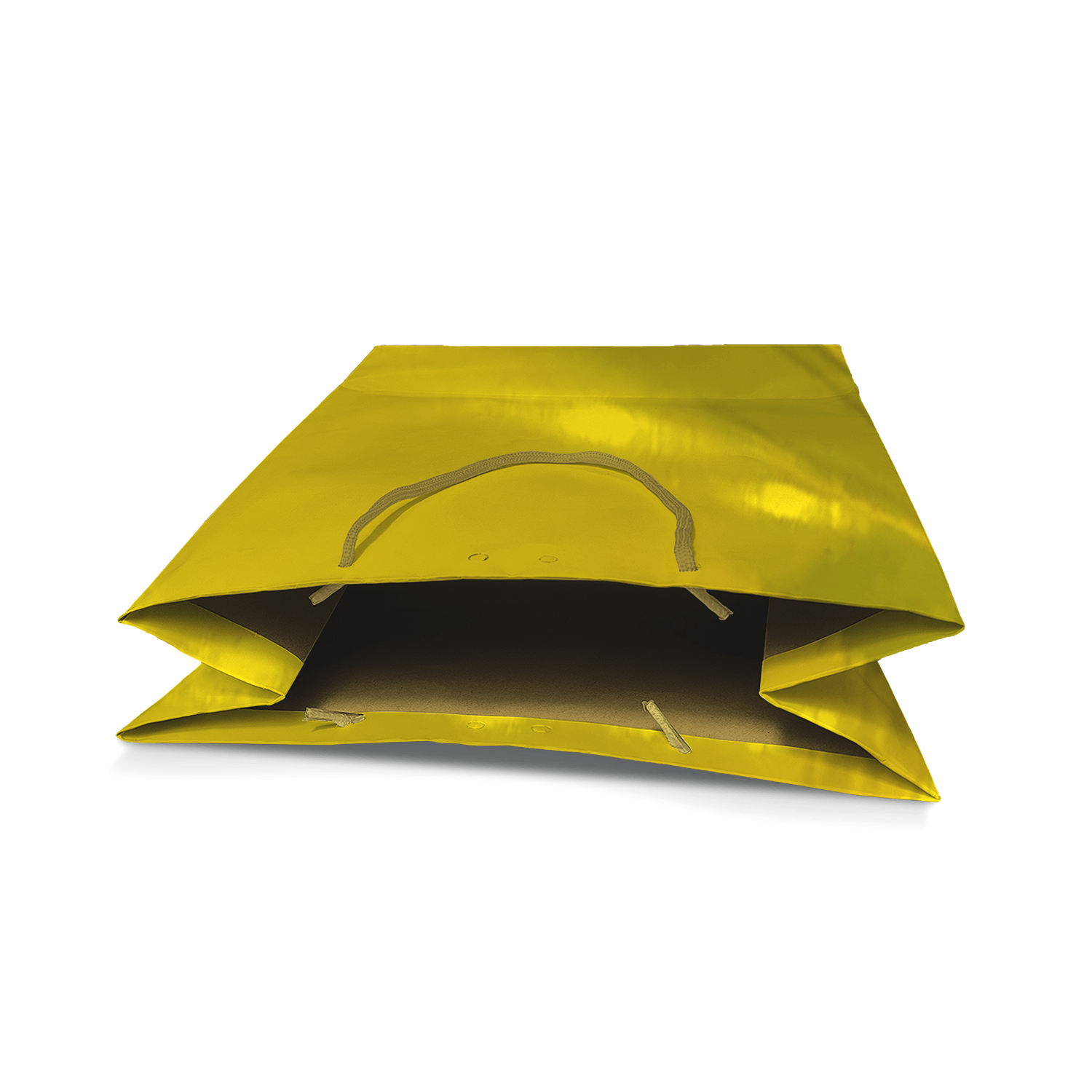 Sacola de papel dourada premium 28x33x13cm ideal para presentes e lojas. Elegante, resistente e perfeita para agregar sofisticação aos seus produtos.